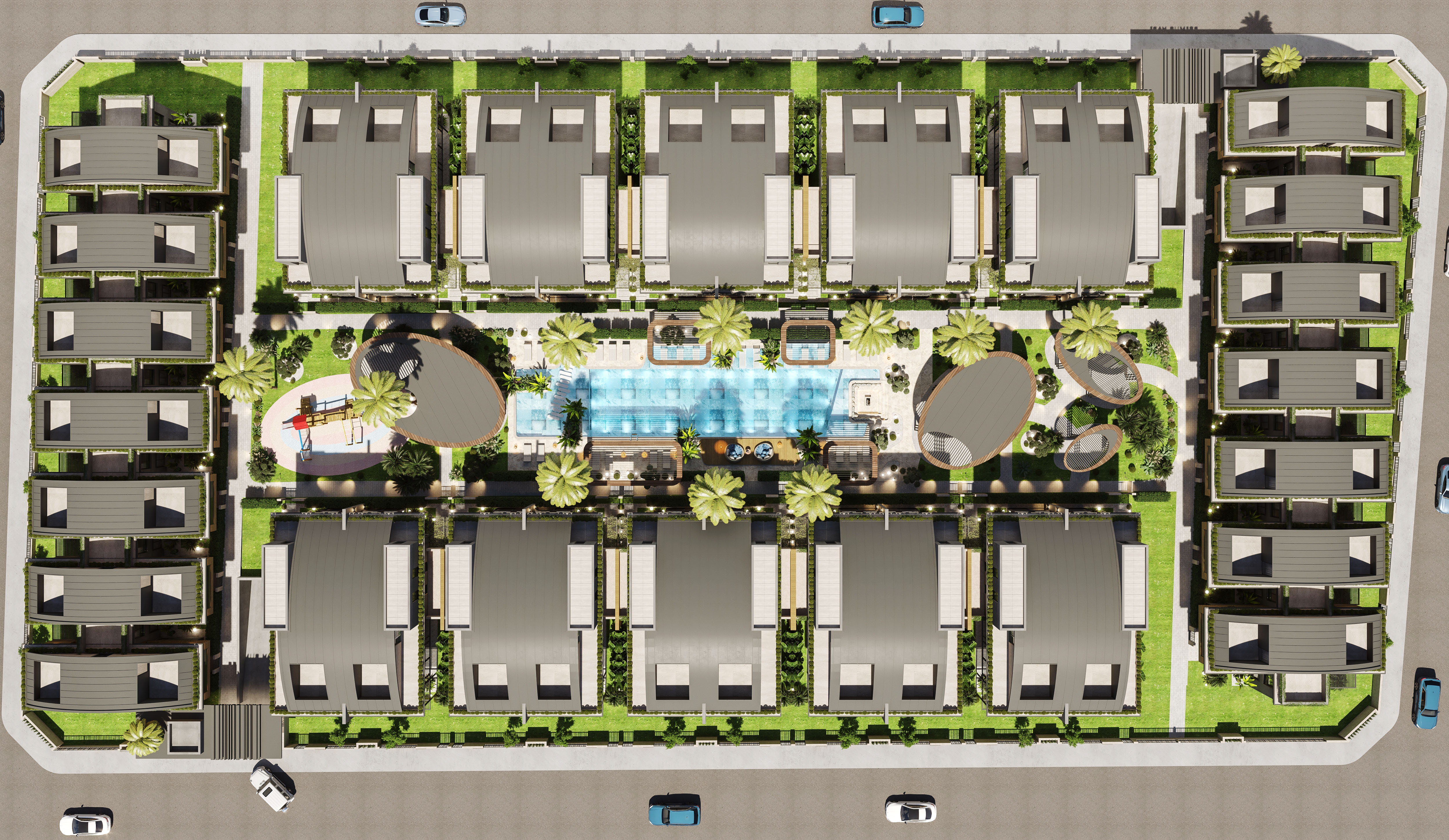 Proje Özellikleri: Özel tasarım havuz, güneşlenme alanları, ateş çukuru, sauna, spor alanı, cep sineması, oyun ve eğlence odası, çocuk oyun alanı, kapalı otopark